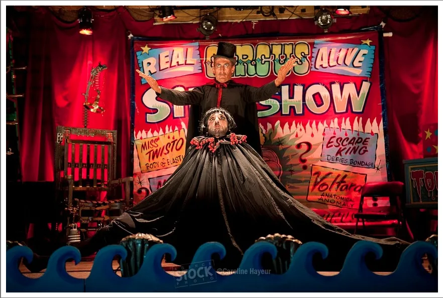 Certifié 100% sideshow véridique puisque nous travaillons avec un maître. D’origine hongroise, Laszlo Kolozsy est né dans une famille de cirque et travaille dans le cirque depuis plus de quarante ans principalement, aux États-Unis. Débusqué à New York dans une fiesta italienne alors qu’il exhibait deux serpents géants, il a été recruté par D. Kimm pour venir partager son savoir avec des artistes montréalais. Au menu, outre les inévitables femmes à barbe, géants et sœurs siamoises, on aura droit à des numéros prestigieux et historiques tels The Sarcophagus of Doom, The Human Pin Cushion, The Escape King, Miss Twisto, Zoltan le Magnifique et Mademoiselle Voltara.